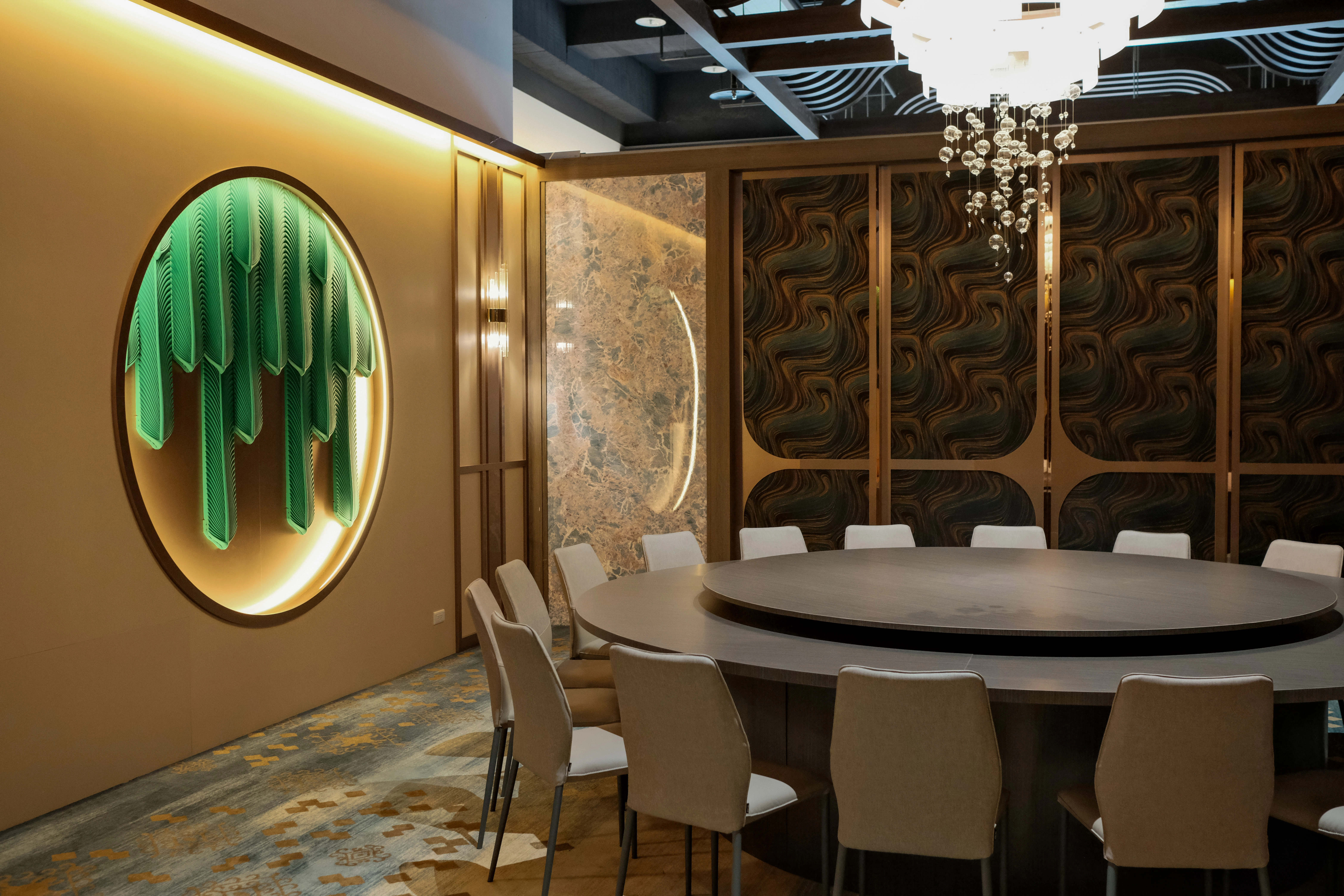 青埔店一樓還設有 7 間 10人圓桌包廂,共可容納約 70 位賓客。每間包廂皆採用可活動式隔板設計,可依人數與需求自由調整空間規模,無論是 10 人小型聚餐,或將多間包廂打通舉辦 10~70 人的中型宴席,都能輕鬆對應。私密性高又具靈活性,是商務宴請、部門聚餐與家庭聚會的理想選擇。
